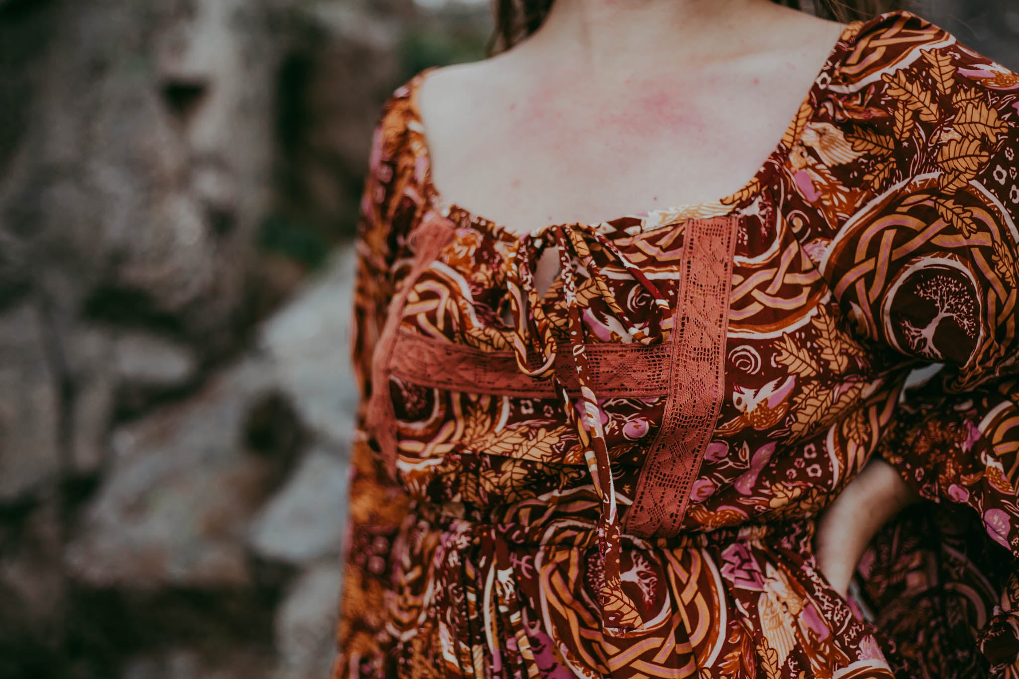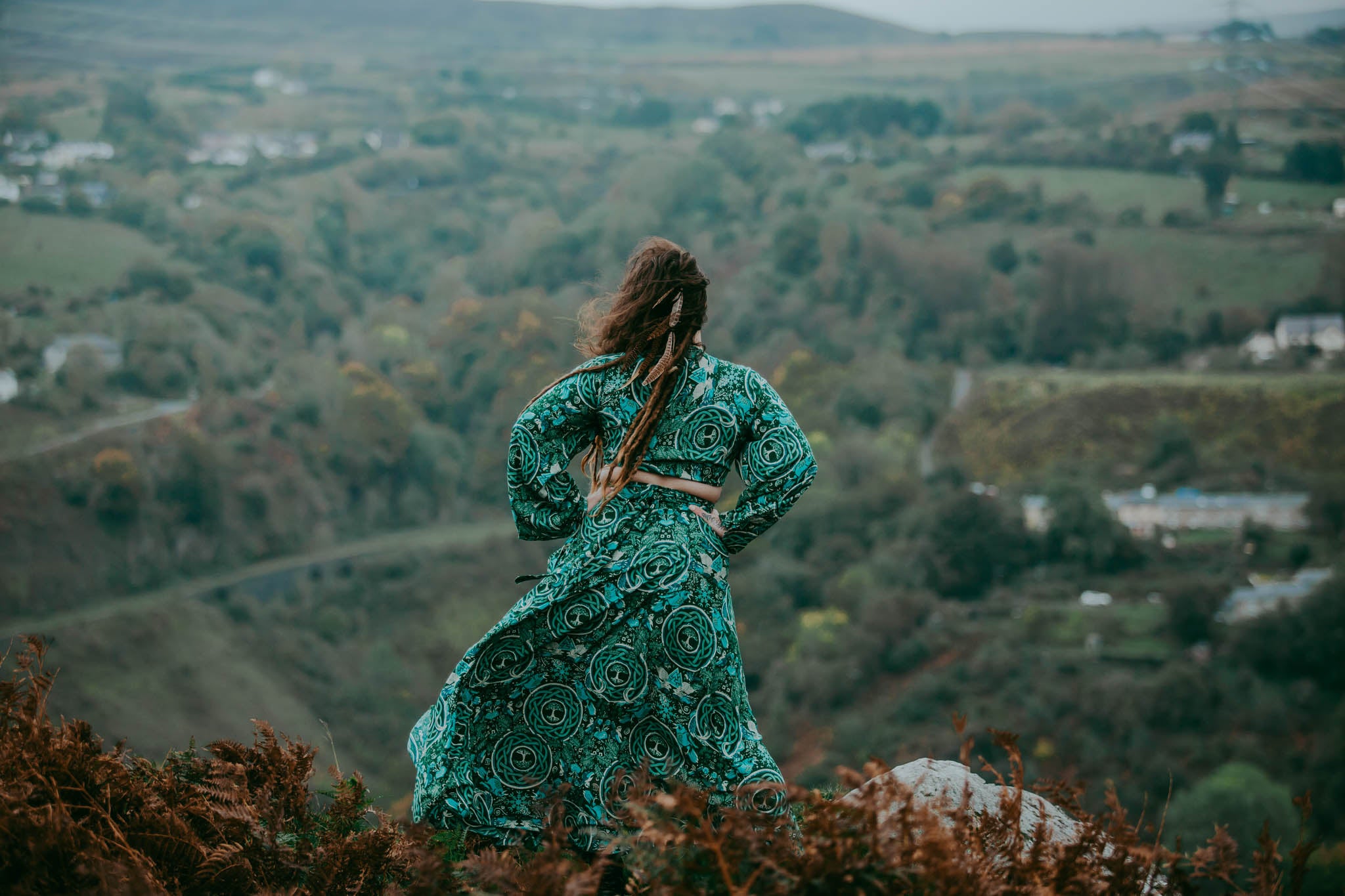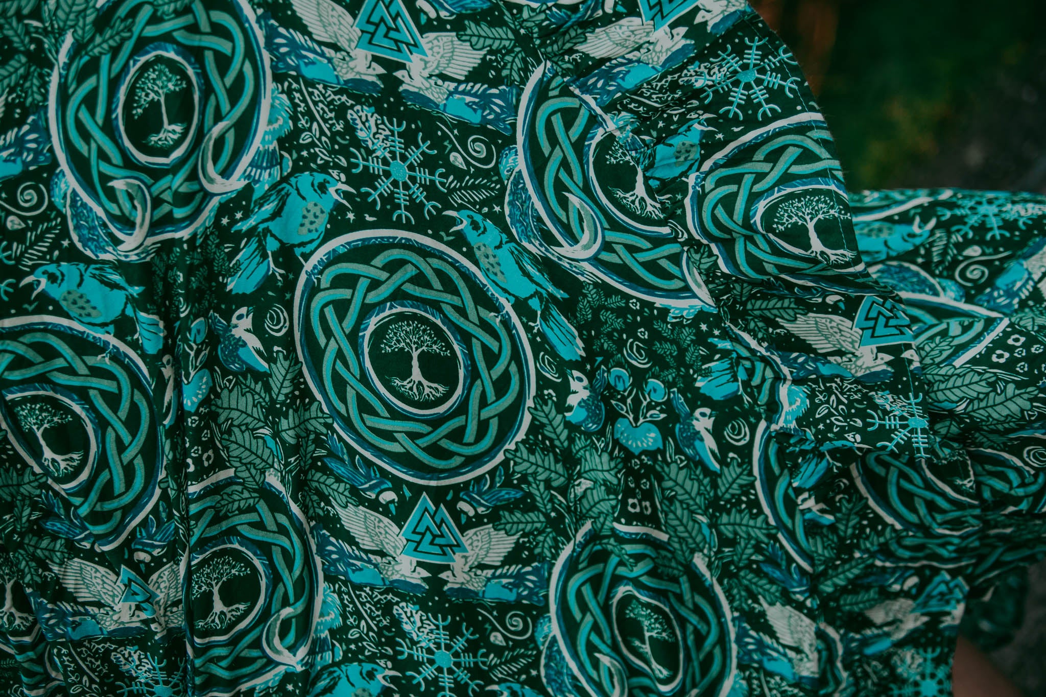 A symbol of women rising, reclaiming, and remembering! This captivating series features custom illustrations infused with symbolic mysticism and magical allure. Each garment is uniquely AE, blending boho aesthetics with unprecedented flair. Crafted from natural, soft fibers for year-round comfort, these pieces evoke the powerful energy of the Shield Maiden, summoning the inner warrior. Inspired by Norse colors and imagery intertwined with Celtic designs, it's the ideal modern adaptation.
