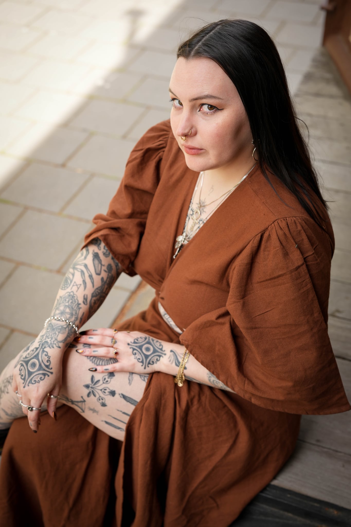 Sustainable hemp cotton, hand wash, cold wash, line dry. Always read the care label inside the garment. Item can be ironed on low heat but we recommend steaming for all special garments!