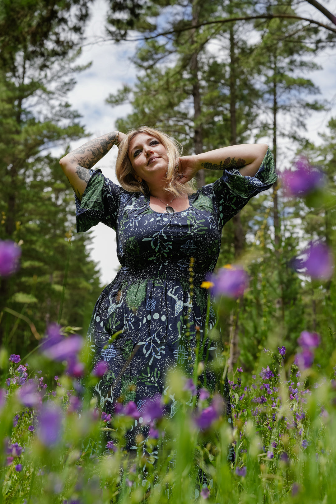 Swish your way through winter wonderland in this Secret Garden Dress; embodying elegance with soft rayon, a comfortable cinched waist, deep pockets, flared sleeves and a stunning forest border